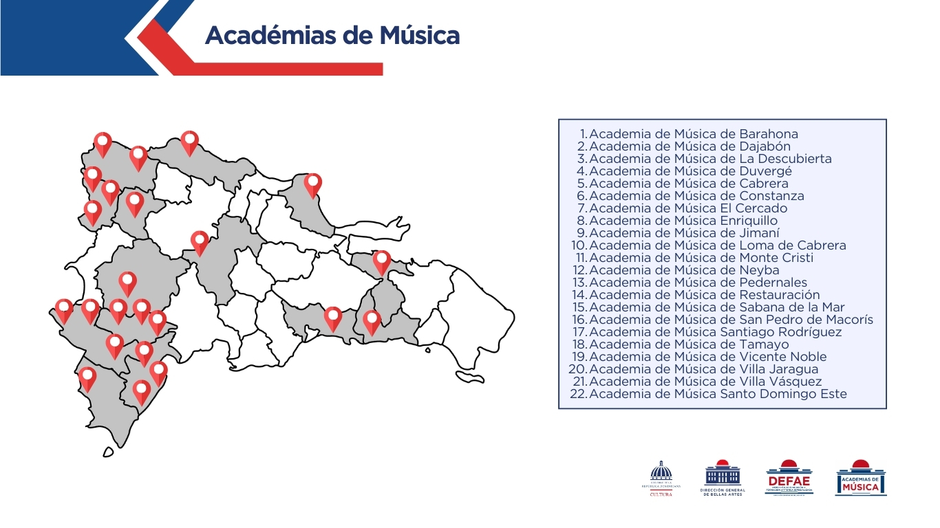 Actualmente existen 22 academias, ubicadas en diferentes municipios y/o provincias de la República Dominicana:
